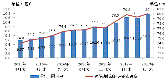 2016-2017年3月手機上網用戶和對移動電話用戶滲透率情況